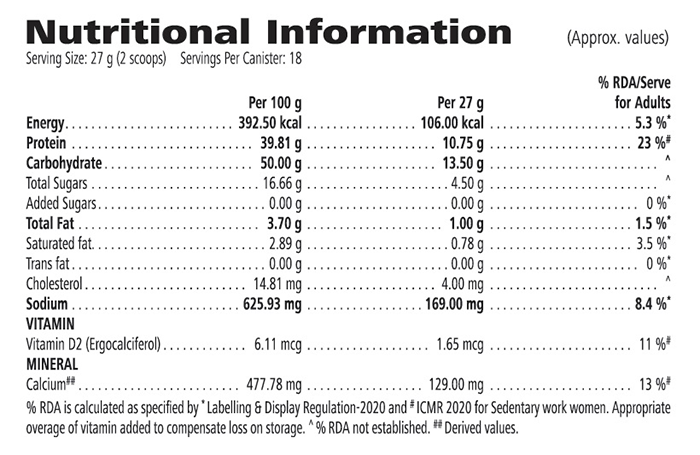 Skimmed Milk Powder, Soy Protein Isolate, Maltodextrin, Starch, Palm Fat Powder, Gelling Agent (Potassium Chloride – INS 508), Natural & Nature Identical Milk Flavouring Substances, Emulsifier [Lecithin Powder – INS 322 (i)], Thickener (Xanthan Gum – INS 415), Sweetener (Steviol Glycoside – INS 960), Stabilizer (Guar Gum – INS 412), Vitamin D2 (Ergocalciferol).